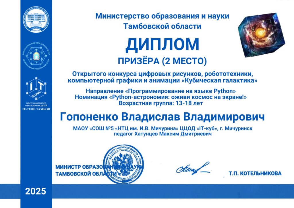Обучающийся центра цифрового образования детей «IT-Куб. Мичуринск» Гопоненко Владислав под руководством педагога Хатунцева Максима Дмитриевича по направлению «Программирование на языке Python» стал призёром на открытом конкурсе цифровых рисунков, робототехники, компьютерной графики и анимации «Кубическая галактика».